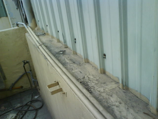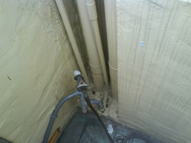 外墻│墻壁防水抓漏工程 ~~上圖中這么多管路的下方是漏水處,它的漏水源大致應(yīng)該是在這里沒有錯, 水是從哪里滲漏說真的沒有一個人可以確實地告訴你, 在施工上我們要以全面性防水施作的心態(tài), 可以防止水無孔不入的特性.